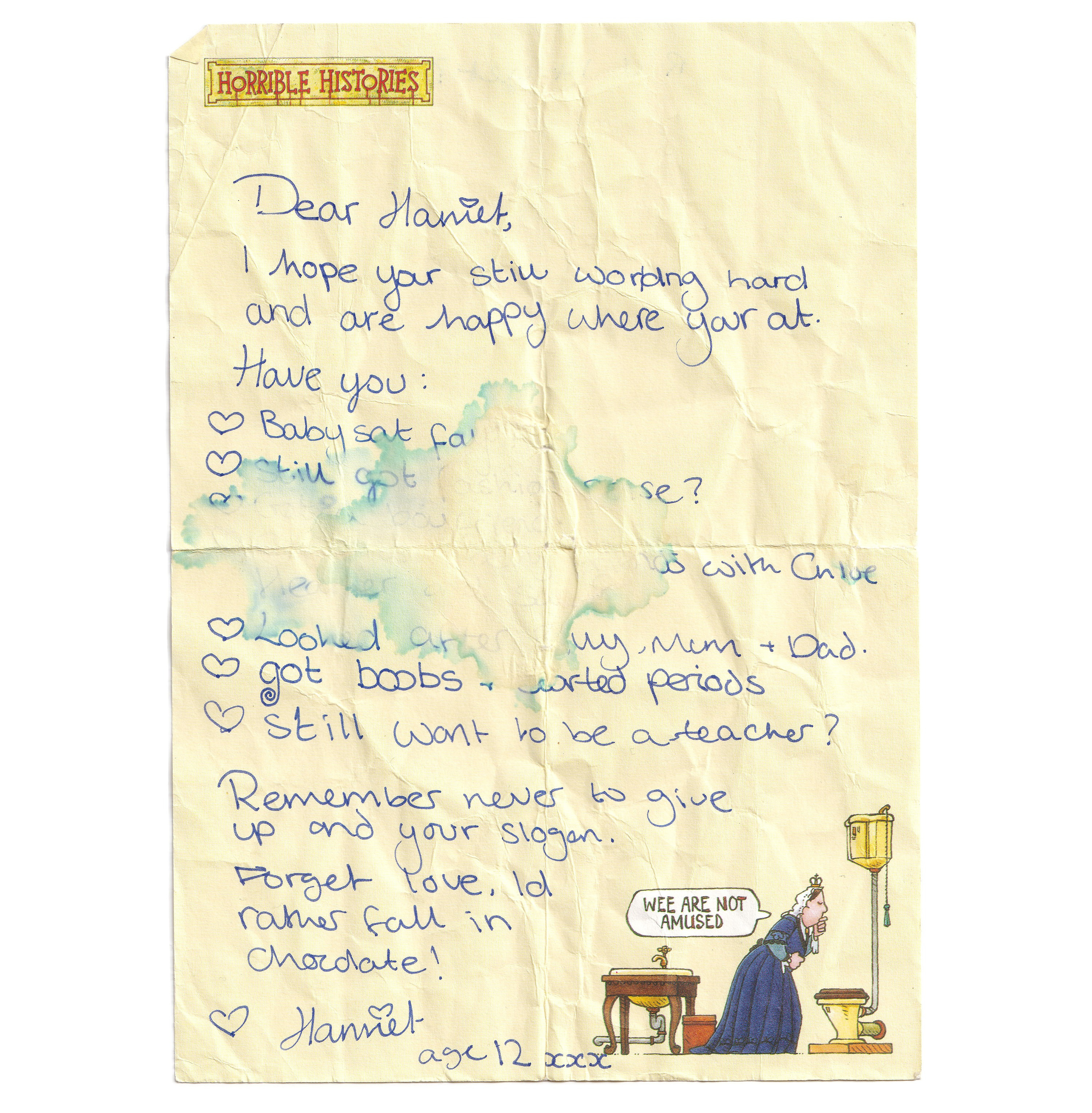 I know there’s flaws to this plan. I think even 11-year-old me knew that, on some level. I know all the cliches; you can't run from your problems, the grass isn't always greener, and so on. What my 11-year-old self hadn't yet experienced—and therefore hadn't factored in—was not disliking one's life, but disliking oneself. Saying that, she did get some things right; like ranking boys in order of hotness on a bar chart in her diary, or dotting the ‘i’ of her signature with a little heart, or writing letters to her future self to remind me of my alleged motto ‘forget love I’d rather fall in chocolate’ (see below). How could I not at least try her silly life-reset plan? What’s the worst that could happen? I end up with a stamp in my passport and a lousy hat? I’ll take it.